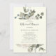Este convite de janto para o ensaio de marfim é perfeito para um evento elegante. O simples design apresenta flores brancas com verde-inverno e folhas de eucalipto, com um sentimento moderno do país.