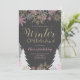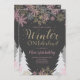 Winter Onederland Aniversário convidado com flocos de neve cor-de-rosa, dourados e prateados, e árvores de inverno reluzentes com cinzas escuras.