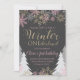 Winter Onederland Aniversário convidado com flocos de neve cor-de-rosa, dourados e prateados, e árvores de inverno reluzentes com cinzas escuras.