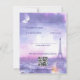 This two-sided RSVP card from the Amour Éternel à la Parisienne collection invites guests to respond with elegance and flair. The front features a dreamy Paris skyline bathed in moonlight, with the Eiffel Tower glowing against watercolor hues of lavender and blush. The reverse includes space for names, attendance, number of guests, special dietary notes, and a personal song request for the DJ—adding a joyful, interactive touch to your celebration. All text is fully customizable, making this card a poetic blend of romance and thoughtful planning.