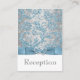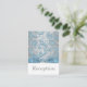 Este elegante cartão azul de gelo, cinza prateada floral FAUX brilhante de recepção de casamento tem um fundo de vários flocos de neve brancos e uma fita azul de aço IMPRESSA e arco com um par de joia de diamante e brilho FAUX uniram corações que correspondem ao convite de casamento mostrado abaixo. Você também pode personalizá-lo para ser um cartão de informações ou instruções, um cartão de registro de presente, um cartão de poço de desejo ou um cartão de caridade, alterando o texto de acordo. Entre em contato com niteowlstudio@gmail.com se precisar de alterações.