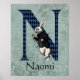 A design de Whimsical para Alice no País das Maravilhas, amantes de todas as idades, apresenta letra maiúscula / inicial N com preenchimento de harlequin preto e azul e ilustração original do Rabbit Branco que foi pintada, em um fundo de cor azul-azul, floral e vírgula angustiado. Personalizar com nome ou outra mensagem