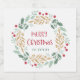 Esta elegante e na moda do vinho espumante de Natal apresenta uma coroa colorida com folhas verdes e douradas e bagas vermelhas, bem como uma tipografia com a mensagem "Feliz Natal" num fundo branco.
