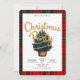 Este cartão é para um convite de festas de Natal. Apresenta uma design festiva com uma xadrez de borda nas cores tradicionais do Natal, vermelha, verde e preta. No centro, há uma ilustração de uma árvore de Natal decorada com luzes de cordas suaves e brilhantes. O texto diz **"Junte-se a nós para uma festa de Natal"** em negrito guião dourado. Abaixo da árvore, os detalhes do evento são claramente listados, incluindo a data e o local. As informações de RSVP são fornecidas na parte inferior, pedindo aos convidados que respondam em uma data específica. O olhar geral é alegre, convidativo e captura o espírito da época de férias.