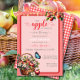 Apresentamos o nosso encantador convite ao Chá de fraldas em cores rosa, vermelha e branca. Um chá de fraldas temático de fruta com cor d'água rosa, vermelha e folhas verdes, um cesto de maçã na frente com detalhes editáveis de chá de fraldas, e xadrez na parte de trás do cartão para celebração inspirada em pomar. script e caligrafia na moda. #applebabyshower #appleofoureyebabyshower #applethemebabyshower