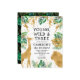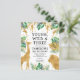 Celebre o terceiro aniversário de sua pequena coisa selvagem com este convite temático "Jovem, Selvagem e Três", com folhas falsas de ouro (girafa, leão e macacos), folhagem de ouro e selva verde, e borrão de ouro. Adicione o nome do seu filho e os detalhes da festa em texto preto sobre um fundo branco. Um padrão de folhagem em verde e dourado em fundo preto decora a parte de trás da carta.