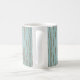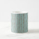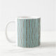 Esta caneca tem uma design geométrica de uma espécie de ovais planas se repetindo através do design em marrom em um campo de azul pálido.