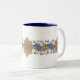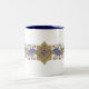 Uma fronteira formal em padrões geométricos ouros com folhas azuis e flores minúsculas, arte safra de um manuscrito antigo.