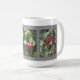 Tire seu dia de folga para um excelente começando com uma caneca de café contendo uma mensagem inspiradora e fotos de hydrangea de folha de carvalho, fuchsia e flores de pincel de garrafa de cremson cercadas por uma borda feita de padrões únicos encontrados no latido de árvores.