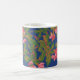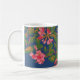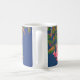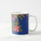 Uma Mug de Café muito bonito e na moda, com Japonica rosa brilhante (Cinza Japonês) sobre fundo azul profundo; de um impressão de serigrafia de Judy Adamson.