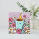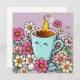 Xícara azul de café quente sentada num lote de desenhos animados bonitos, cor-de-rosa e adesivos de flores amarelas.