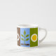 Espresso Mug com bandeira de Fresno, Califórnia; bandeira com três bandas verticais de castanho, azul e verde, com ilustrações estilizadas de berço, planta e sol