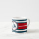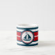 Design náutica com decoração em forma redonda de embarcações à vela, em fundo listrado vermelho, azul e branco
