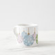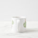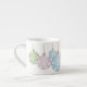 Esta taça espresso apresenta três Enfeites de natal coloridos não tradicionais em verde-pastel, rosa e azul com estrelas brancas. Os ornamentos em diferentes tamanhos rodeiam a caneca sobre um fundo branco.