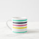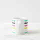 Um copo colorido de Espresso desenhado com um padrão listrado. O resfriador é principalmente branco com faixas horizontais em preto, rosa, amarelo e turquesa.