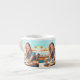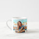 Garota sorridente com um café relaxante, cappuccino. Imagem artística para uma pausa relaxante e divertida, com um fundo marinho ensolarado.