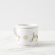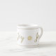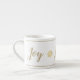 Esta caneca espresso é mostrada em branco, com texto colorido do ouro e design do floco de neve com destaque para pinstripe no topo e no fundo. Texto no roteiro de diversão do rico de "Alegria". Personalize este item ou comprar conforme projetado.