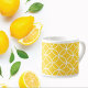 Uma xícara de espresso, amarela-limão e branca, ensolarada, com um padrão geométrico.