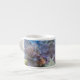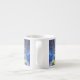O adorável peixe-leão nesta Taça Espresso está nadando num aquário de água salgada colorida. É uma fotografia original de ZoeSPEAK, mostrando o padrão de tiras espessas e finas e barbatanas de rico neste peixe com aparência incomum. É uma foto colorida com o azul tropical, amarelo e rosa do aquário e o nariz rosa-salmão do peixe.