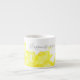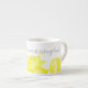 Uma elegante xícara de espresso floral personalizada para a noiva ou para dar como presentes de damas de ponte decorados com tulipas amarelas moles pintadas com aquarela acentuadas com pontos festivos de aspersão de aquarela e texto de cinza. Uma xícara que a noiva pode usar para apreciar um café enquanto a escrevendo, agradecemos notas e juntando planos no seu diário de noivas. Você pode personalizar o texto para ajustado das suas necessidades.