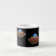 Um enxame de OVNIs vibrantes e luminescentes atravessa o vazio do espaço, decorado com cores azul, vermelha e marrom. Contra a extensão profunda do fundo do espaço negro.