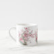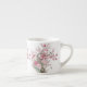 a white ceramic mug decorated with a delicate, traditional Oriental-style floral illustration. The design showcases a gnarled, dark tree trunk extending into branches laden with vibrant pink cherry blossoms and soft pink peonies.