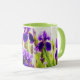 Esta caneca floral bonito apresenta minha fotografia original de flores íris púrpuras em um jardim, processada com uma técnica de aquarela para um estilo ilustrado e pareado com um toque de chorona. Ele tem um dentro verde colorido e na alça, que pode ser alterado se desejado. Estas são canecas de 11 onças, do tamanho perfeito para o café ou chá da sua casa - ou até chocolate quente! Ele faria um presente de excelente e você poderia colocar pacotes de café, bolsas de chá ou dentro de chocolate quente. Uma outra ideia de presente é colocar uma pequena planta nela para torná-la mais especial para o seu amado.