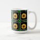 Esta caneca bonito apresenta um padrão antigo de quadrados processados e criados digitalmente por mim em um padrão retrorreflector de quadrados angustiados com girassóis ilustrados em cada quadrado.