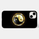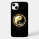 Joias, símbolo yin yang dourado e preto em um fundo preto. Yin yang dourado.