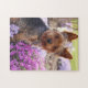 Yorkshire Terriers são cachorros muito especiais com uma grande personalidade e este fofo quebra-cabeça Yorkie jigsóis é simplesmente especial. Esta fotografia é de uma garotinha muito viscosa sentada numa cama de flores roxas.
