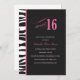 Este doce convite de festas de 16 apresenta um padrão de impressão zebra à esquerda, e "doce 16" na bonito tipografia rosa. Os detalhes da festa dela ficam em branco sobre o fundo preto.