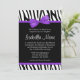Um padrão de zebra preto-e-branco com um gráfico de arco roxo é apresentado neste divertido convite do Bat Mitzvah. Produtos correspondentes disponíveis. As designs são ilustrações/gráficos impressos - NÃO É REAL.