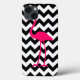 Uma silhueta ou forma rosa brilhante e cor-de-rosa brilhante contra um padrão de ziguezague preto e branco contrastante.